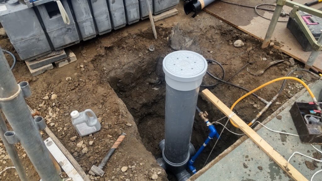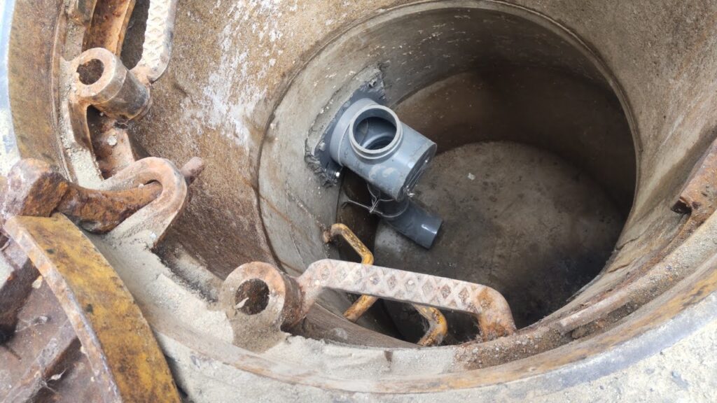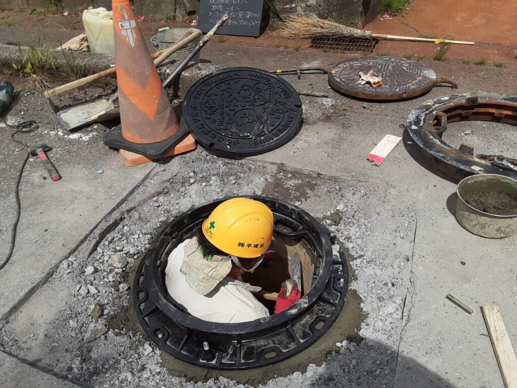 老朽化したマンホールの取替。新たに下水道へのつなぎ込、配管工事を行います。