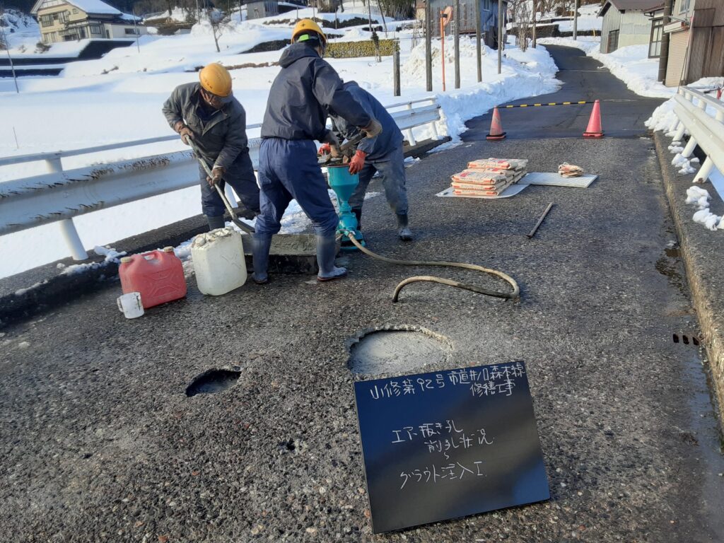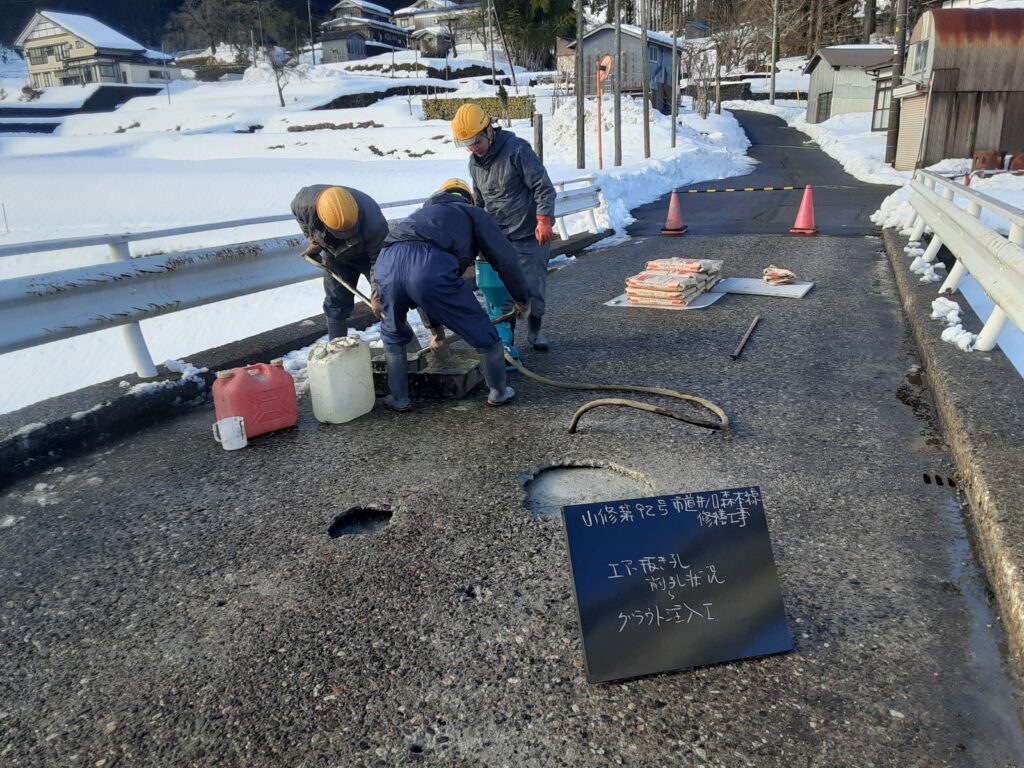 そういう場合においてはエポキシ樹脂系接着材の静的注入、流動性高強度モルタルの充填により補強・補修を行います。